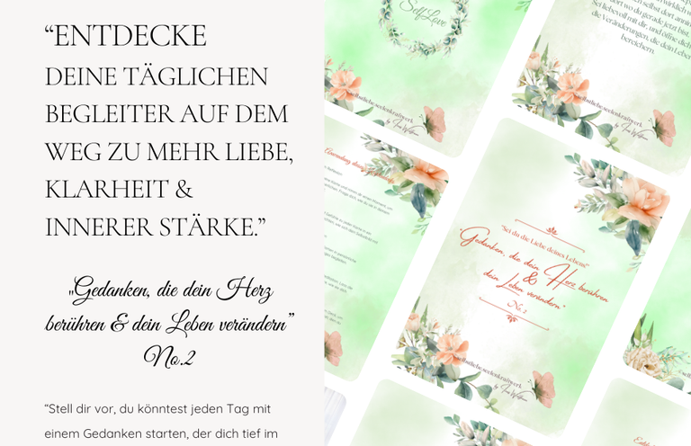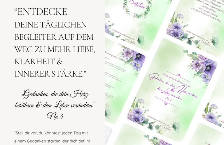 Genau dafür wurde das Kartendeck "Gedanken, die dein Herz berühren & dein Leben verändern" erschaffen, ein liebevoll gestaltetes Set, das dich auf deiner Reise zur Selbstliebe, innerem Wachstum und Achtsamkeit begleitet.